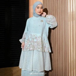 Detail Atasan : Kerah shanghai model ruffle, zipper belakang, model lengan balon, ujung lengan elastis, kombinasi renda dibagian bawah